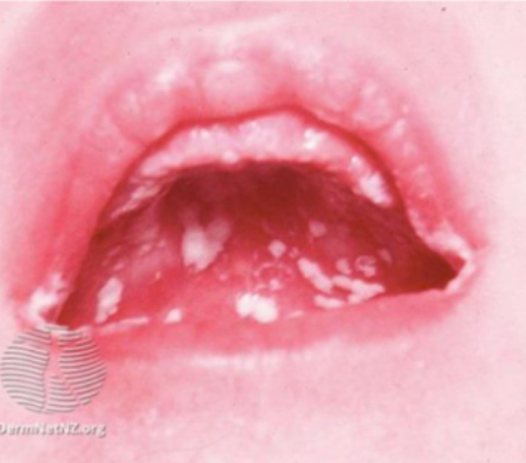 Pensle barnets munn med nystatin mikstur 4 ganger daglig etter amming i en–to uker. Be foreldrene tørke av belegg før påføring av mikstur, som gjerne kan smøres på slimhinnene og ikke sprøytes i munn. Vi finner ikke dokumentasjon for at mikstur med eller uten sukker har ulik effekt på behandlingen. Imidlertid bør man tenke på kariesutvikling hos eldre barn etter tannfrembrudd.