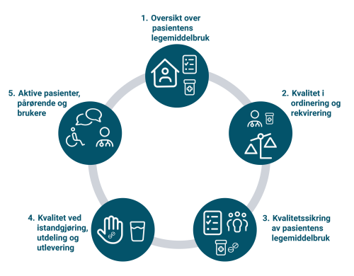 Her presenteres de sentrale trinnene i en god praksis for riktig legemiddelbruk med egne gjennomføringsområder.