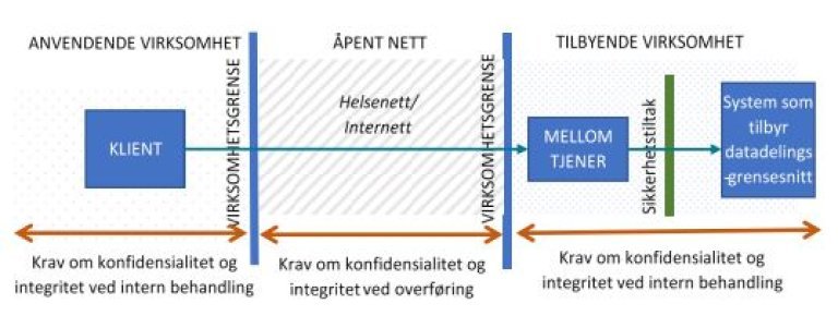Krav til konfidensialitet og integritet må sikres ved bruk av et datadelingsgrensesnitt over åpne nett. Figuren under viser en skjematisk, forenklet skisse av bruk av datadelingsgrensesnitt.