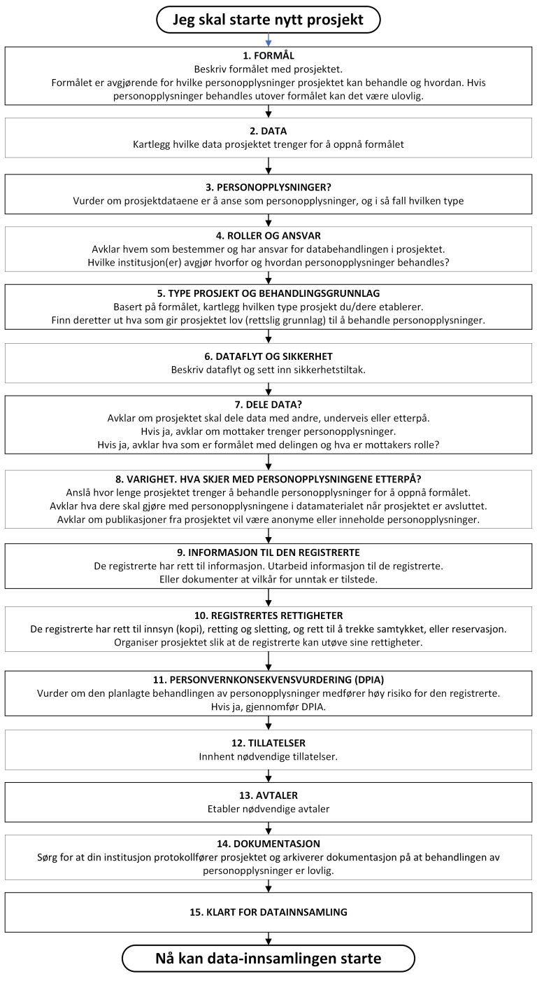 Vår anbefaling er at du leser igjennom hele veilederen og skisserer stegene i oppsatt rekkefølge for ditt prosjekt. Alternativt kan du bruke veilederen parallelt med at du utarbeider søknader, går i dialog med samarbeidspartnere og evt. begynner på DPIA. Det viktigste er at du fullfører alle stegene før søknader sendes, avtaler inngås og DPIA sendes til godkjenning.