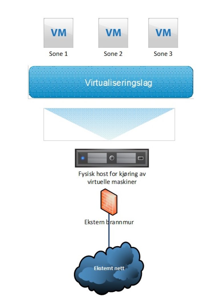 - Virtualiseringsteknologi benyttes for å lage logiske skiller mellom de ulike sonene som etableres på samme fysiske infrastruktur.
