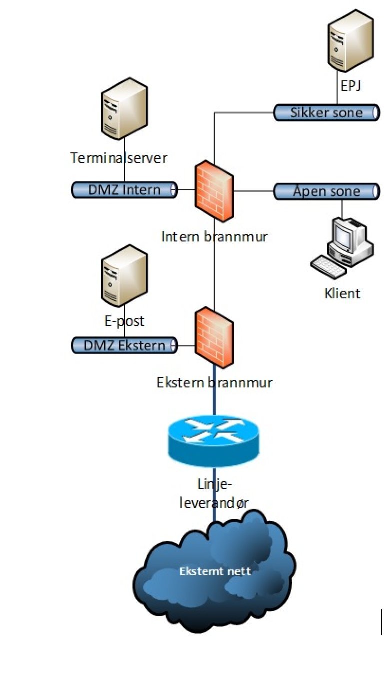 - DMZ-soner tilknyttet både ekstern og intern brannmur for terminering av trafikk inn mot eller ut fra henholdsvis sikker sone (EPJ) og åpen sone (E-post).