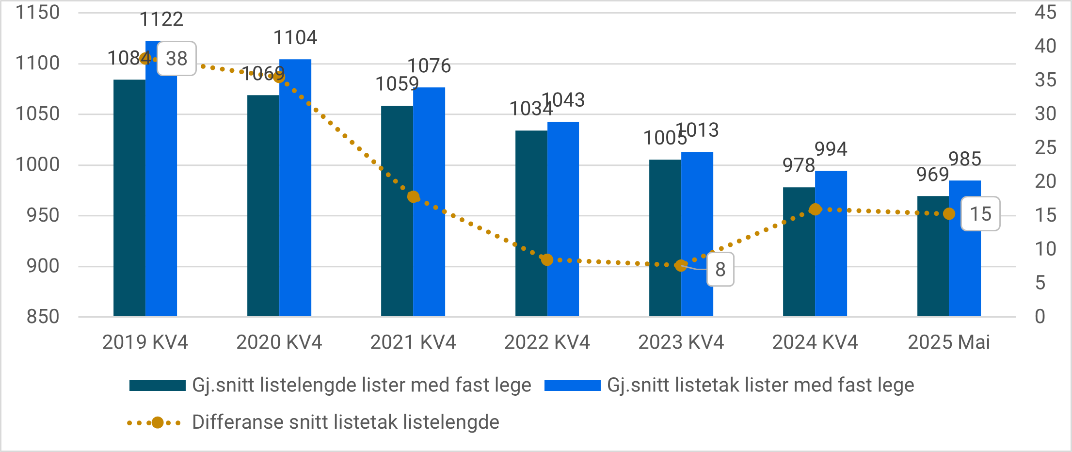 Figur 7.30 Utvikling i gjennomsnittlig listelengde og listetak, samt differansen mellom disse, per desember 2019-2024 samt mai 2025