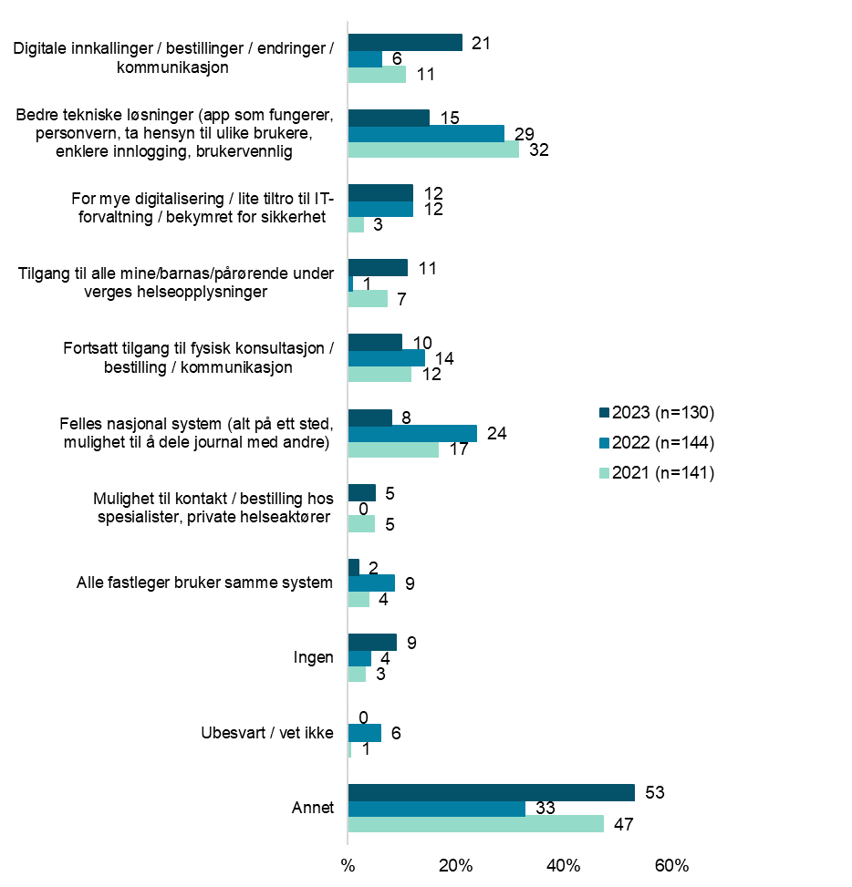 130 respondenter har lagt inn svar i fritekst i 2023. Svarene er kodet (gruppert) i figur 3.26. Digitale innkallinger / bestillinger (21 %) er et innspill som går igjen blant innbyggerne. Videre spiller innbyggerne inn forventninger om bedre tekniske løsninger (15 %) og at det er for mye digitalisering (12 %) i 2023. Annet-svar som ikke er kodet strekker seg fra kommentarer om å få tidligere håndskrevne journaler digitalisert til sømløse tjenester mellom kommunene. I 2022 var det mest utbredt med innspill om bedre tekniske løsninger og felles nasjonalt system. Merk at det er små baser på dette spørsmålet i 2023 (n=130), dvs. oppgitte andeler består av begrenset antall svar. Tilsvarende gjelder også for tidligere undersøkelsesår.