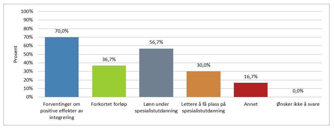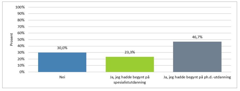 En av kandidatene som har svart at hen hadde begynt på spesialistutdanning, hadde også begynt på ph.d.-utdanning, men hadde ikke mulighet for å krysse av for begge. I realiteten hadde derfor 15 (50 %) begynt på ph.d.-utdanning før de søkte integrert DKO.