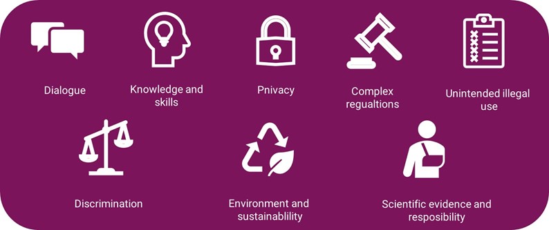 Some risk areas can have consequences for patient safety and quality in health services (Figure 2): the dialogue between human and machine, dependency that can arise with extensive use of AI tools, and privacy in handling sensitive data. Other risks are more overarching and relate to complexity in and interaction between various regulations, unintended illegal use of large language models, discrimination against individuals or groups based on biases in the models, environment and sustainability, and where or with whom responsibility lies if errors occur.