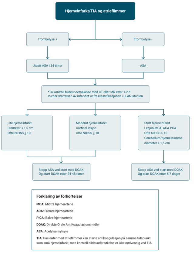 Kunnskapsgrunnlaget gir ikke sikre holdepunkter for flere blødninger eller økt blødningsrisiko ved tidlig oppstart av antikoagulasjon. Blødningsrisikoen er lav både ved tidlig og sen oppstart. I studiene var det en overvekt av små og moderate infarkter og knapt hver 4. pasient hadde et stort infarkt. Det er noe blødningsrisiko ved store hjerneinfarkter, men ved å utsette oppstart av antikoagualsjon til dag 6 eller 7 etter symptomdebut, vurderes risikoen for blødninger å være lav. Ved å inkludere NIHSS skår i vuderingen av store hjerneinfarkter, kan risiko for blødning ytterligere reduseres.