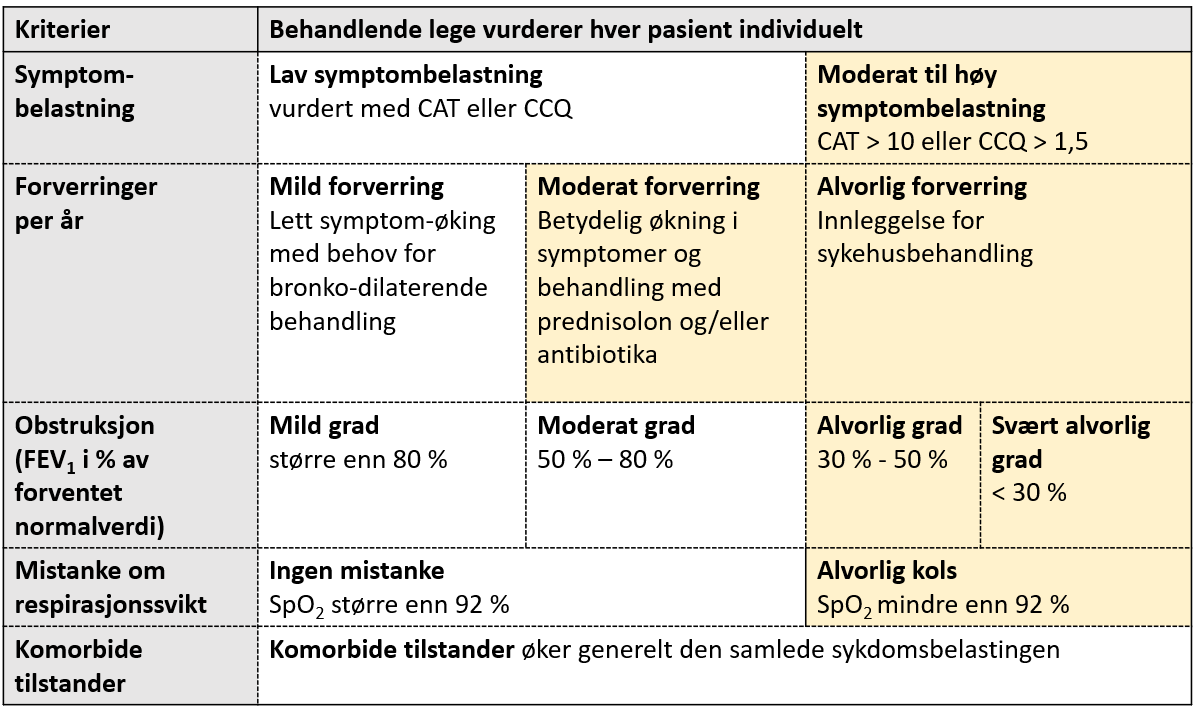 Oppfølging over tid med vurdering av kriteriene under vil fange opp pasienter som utvikler økende alvorlighetsgrad av kols: