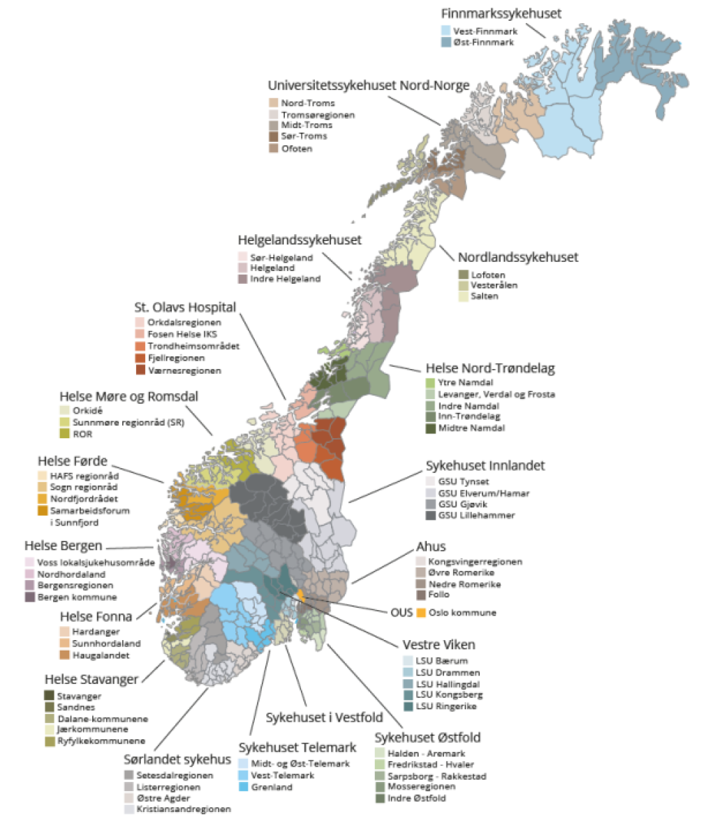 Det er etablert 19 helsefellesskap med utgangspunkt i de geografiske opptaksområdene for helseforetakene. I helsefellesskapene møtes representanter fra kommuner og sykehus, brukere og lokale fastleger for å planlegge og utvikle tjenester sammen. Helsefellesskapene er ikke en juridisk enhet, men en arena for samhandling på ulike nivåer. Samarbeidet mellom kommuner og helseforetak er forankret i den lovpålagte samarbeidsavtalen.